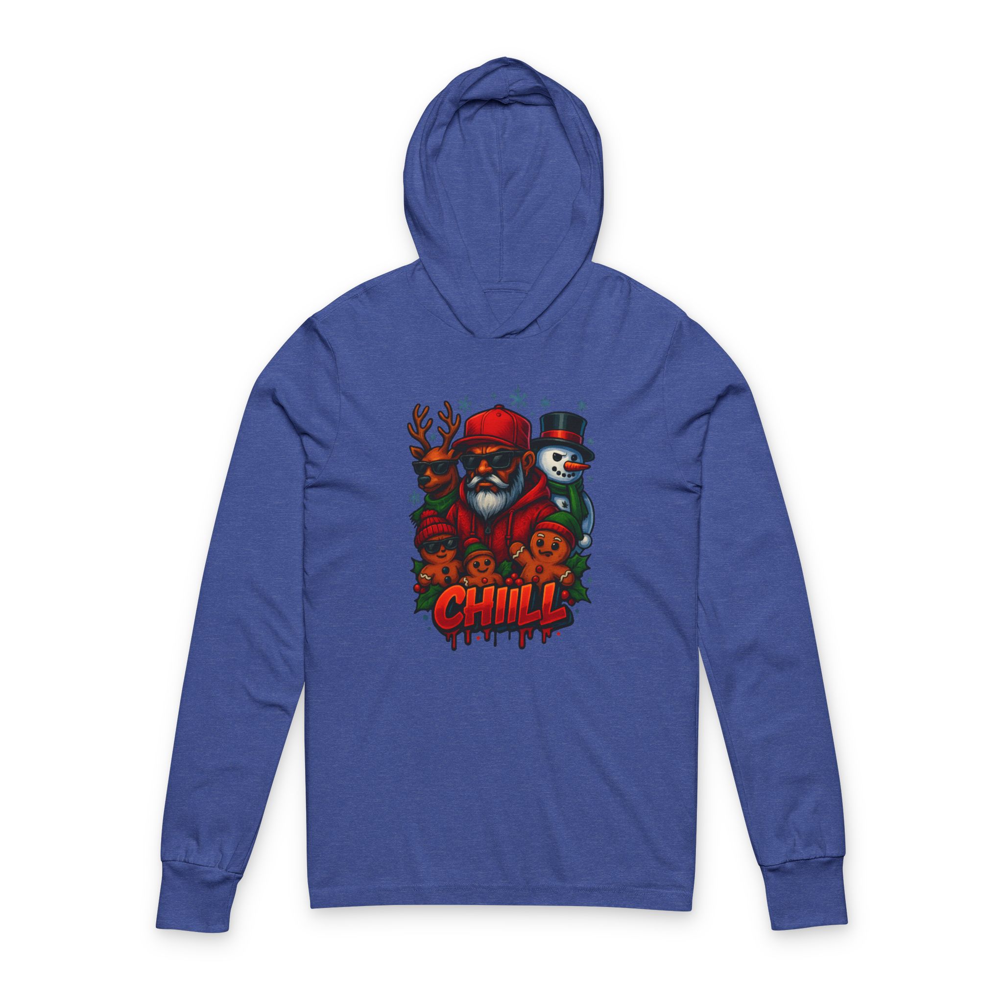 Soft, lightweight hooded long-sleeve that reads like a holiday street scene. A bold, slightly dark Santa-and-snowman graphic sits on the chest with dripping paint details and the word “CHILL” in gritty lettering. The shirt feels relaxed and breathable — good for layering under a jacket or wearing solo on chilly evenings. It brings a playful, slightly rebellious holiday energy that fits casual winter hangs, late-night markets, and cozy nights in with friends. The hood and long sleeves add extra warmth without bulk, while the crossover V at the neckline gives a subtle vintage touch. Wear it when you want seasonal spirit with attitude.